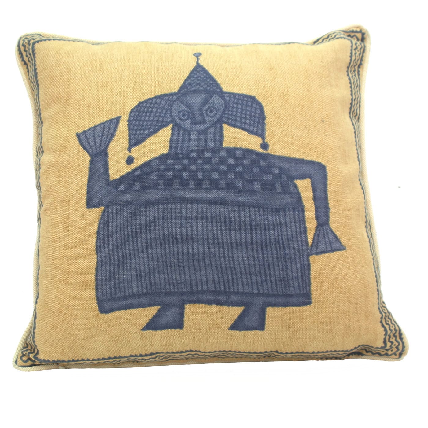 A 22″ Aztec cushion cover in colour blue that features abstract animals and tribal people, a 24″ fibre or feather paddings are also available.