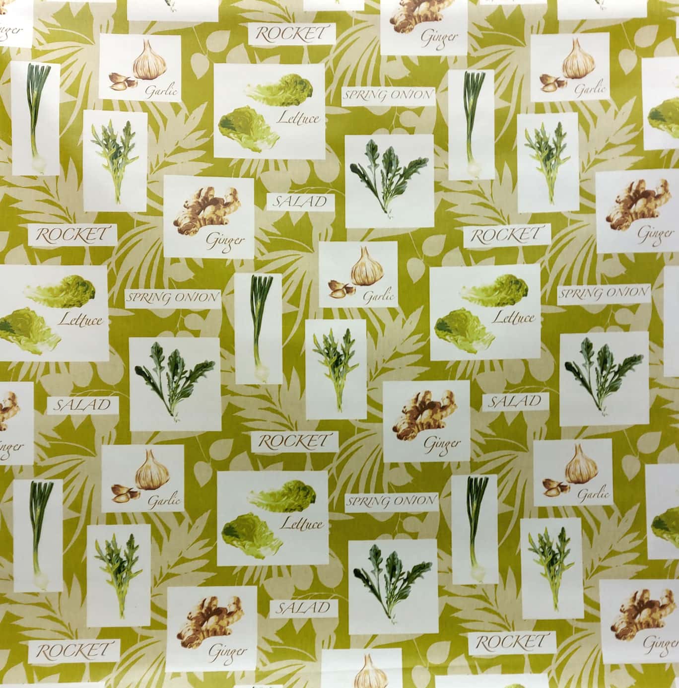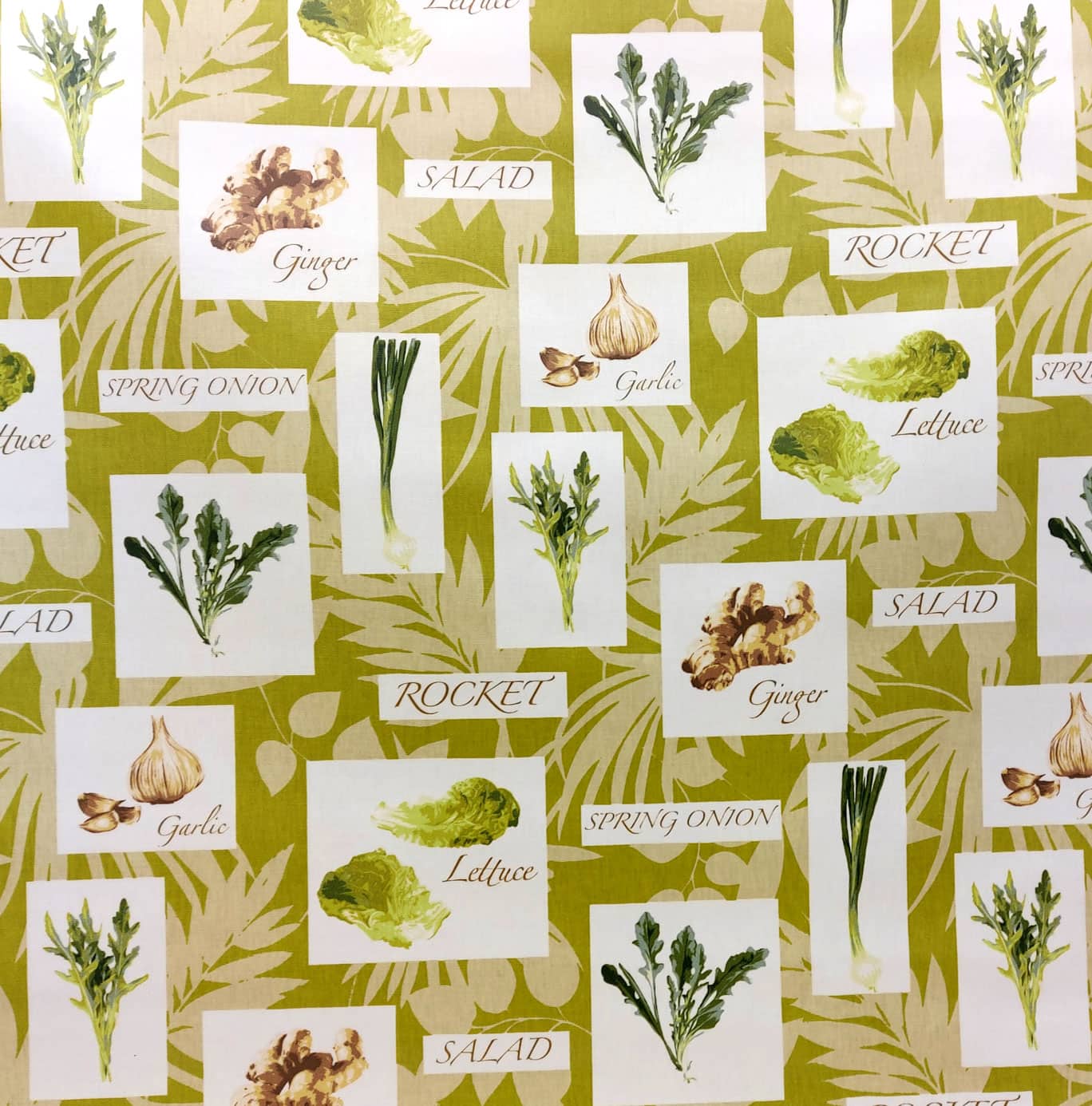 Summer Salad in colour Olive, SUMOLI PVC. Presentation of various vegetables that you might need to make the perfect summer salad. PVC and Vinyl fabrics create an easy way to give new life to your interior, adding unique style and colour while also protecting your precious tables from scratches and dents.