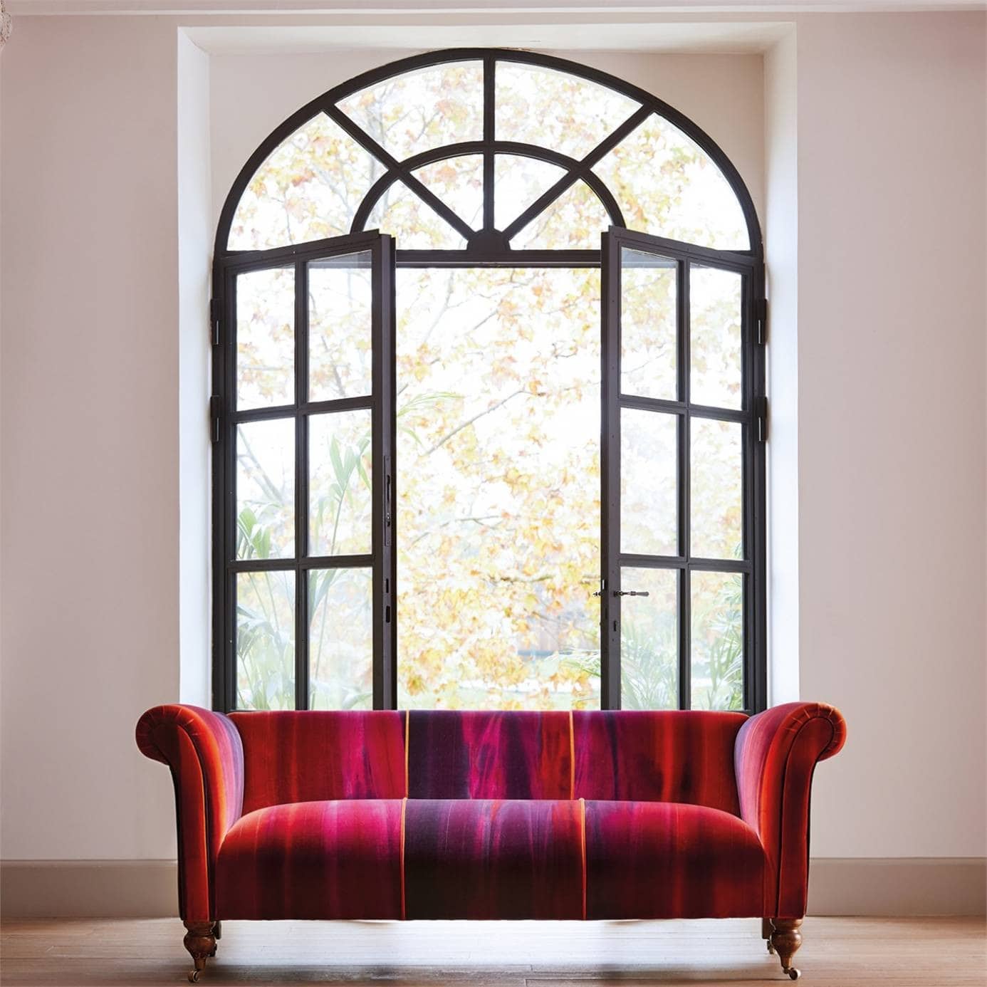 Amazilia Velvet Fabric in colour Papaya / Loganberry / Raspberry, HAMV131510. A very popular fabric from the Harlequins collection Amazilia Velvets, this luxurious short-piled velvet features a beautiful ombre effect with elegantly blending colourways of vibrant orange, red and purple hues. Suitable for made to measure curtains, roman blinds, accessories and upholstery.