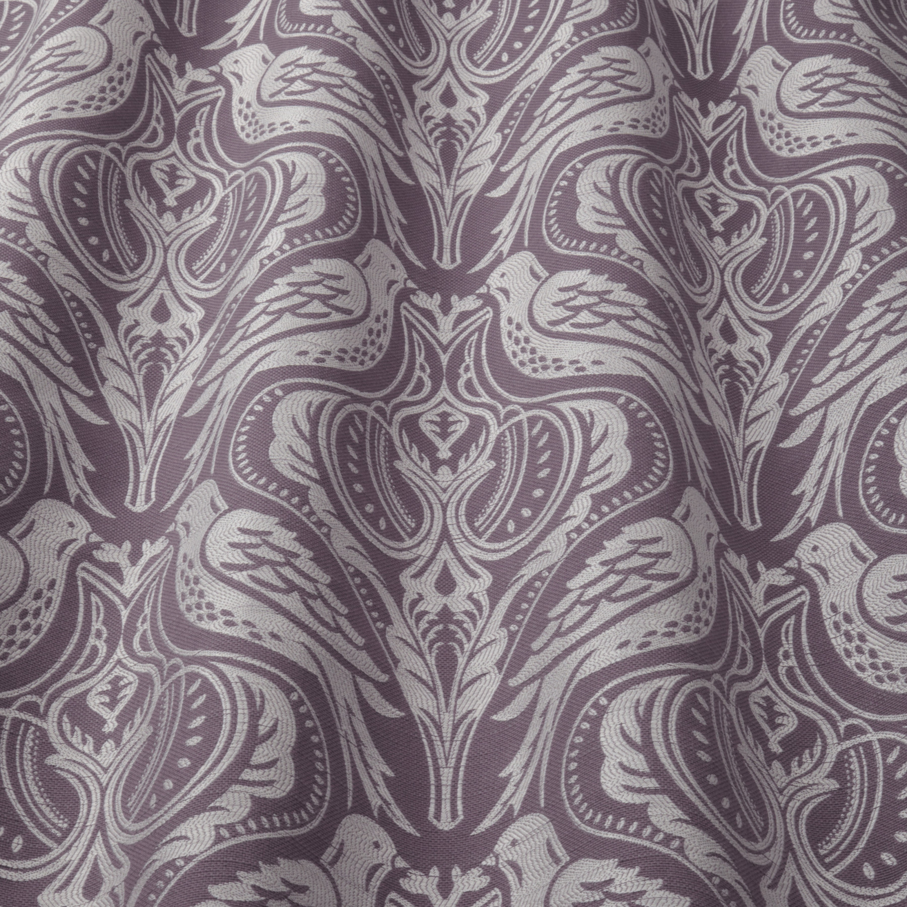 iLiv Song Thrush fabric in colour Grape, SONGTHRUSHGRAPE. This Jacquard fabric has a Floral design, and is made using 34% Polyester 34% Cotton 32% Viscose. It is suitable for made to measure Curtains, Roman Blinds, Accessories.