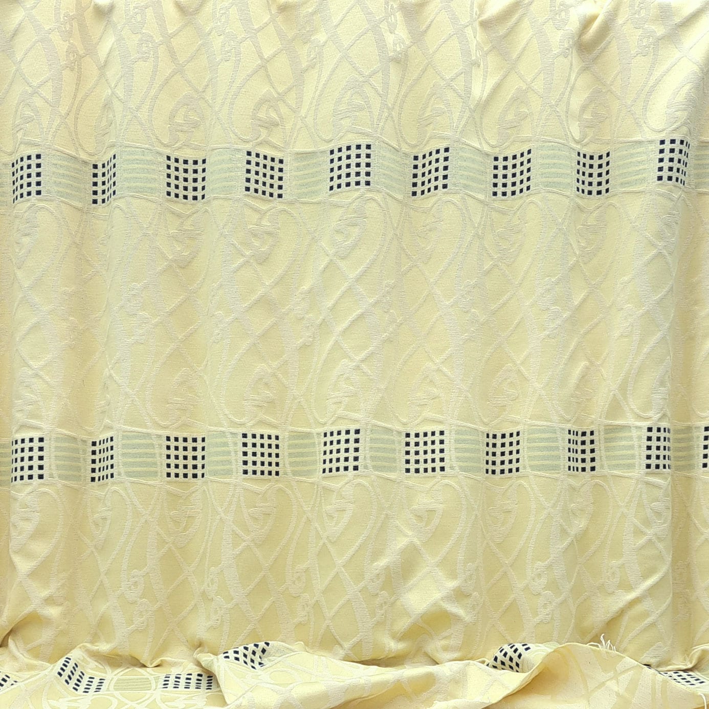 Makintosh fabric in colour Oyster/Navy, SEMAK001. Featuring a subtle design of swirling lines and horizontal stripes, this cotton jacquard fabric and its relaxing colour palette and atmosphere make it ideal for many homes. Suitable for made to measure curtains, roman blinds and accessories.