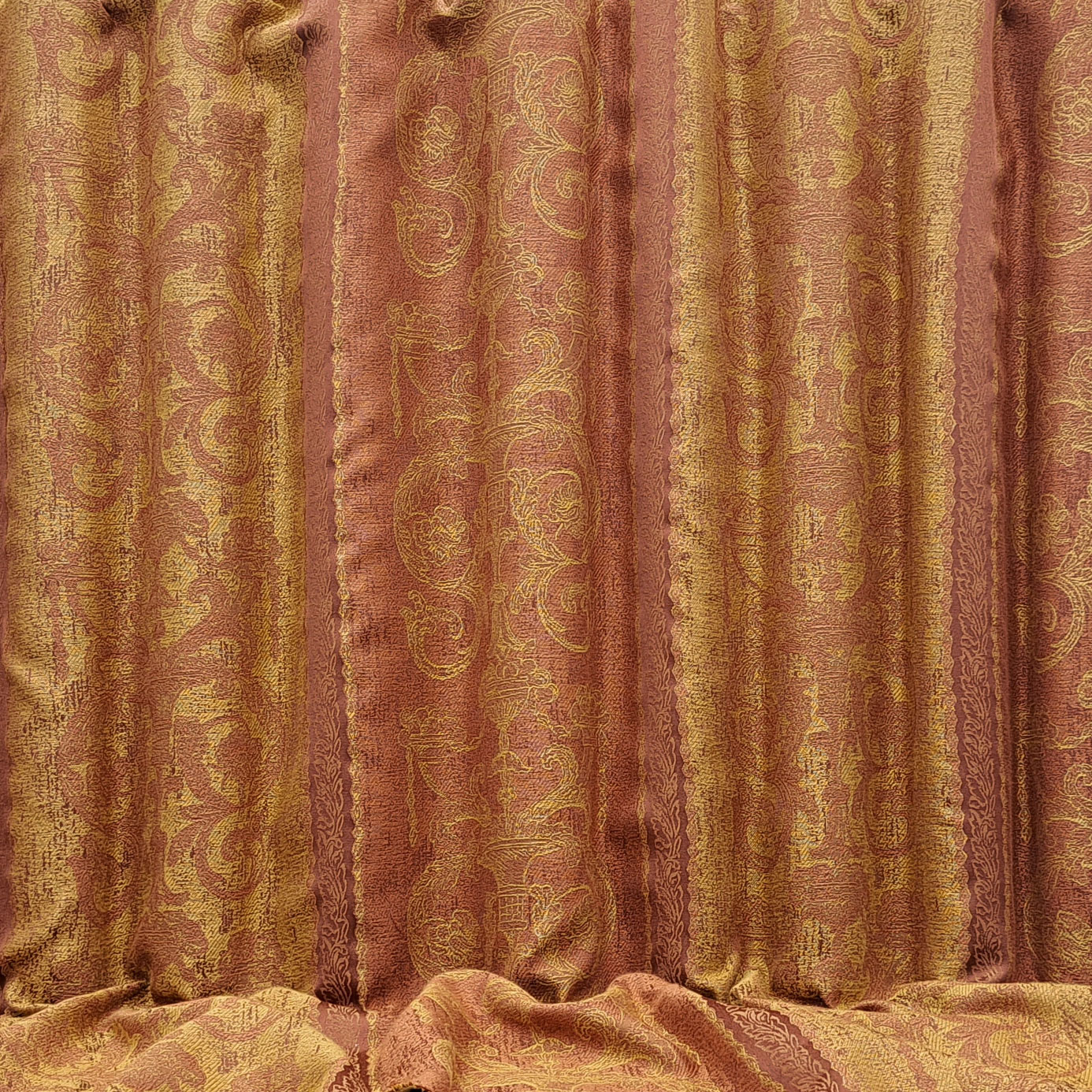 Mombasa fabric in colour Terracotta, SEMOM002. This busy fabric features a lot of texture with its woven style, presented on a jacquard base are large stripes with decorative royal style emblems. Suitable for made to measure curtains, roman blinds and accessories.